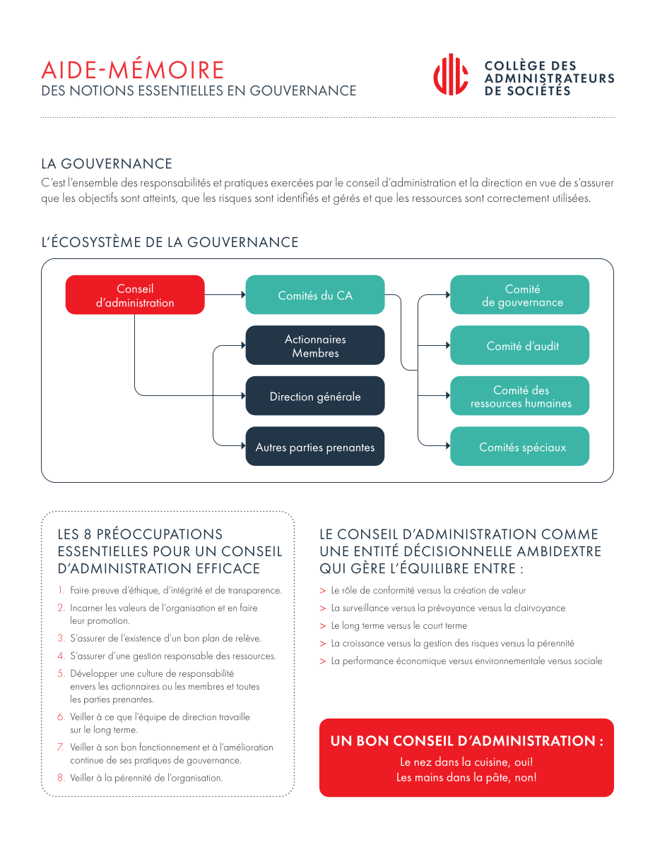 Cette fiche pratique, conçue par le Collège des administrateurs de sociétés de l’Université Laval, constitue un aide-mémoire essentiel pour les membres de conseils d’administration (C.A.).