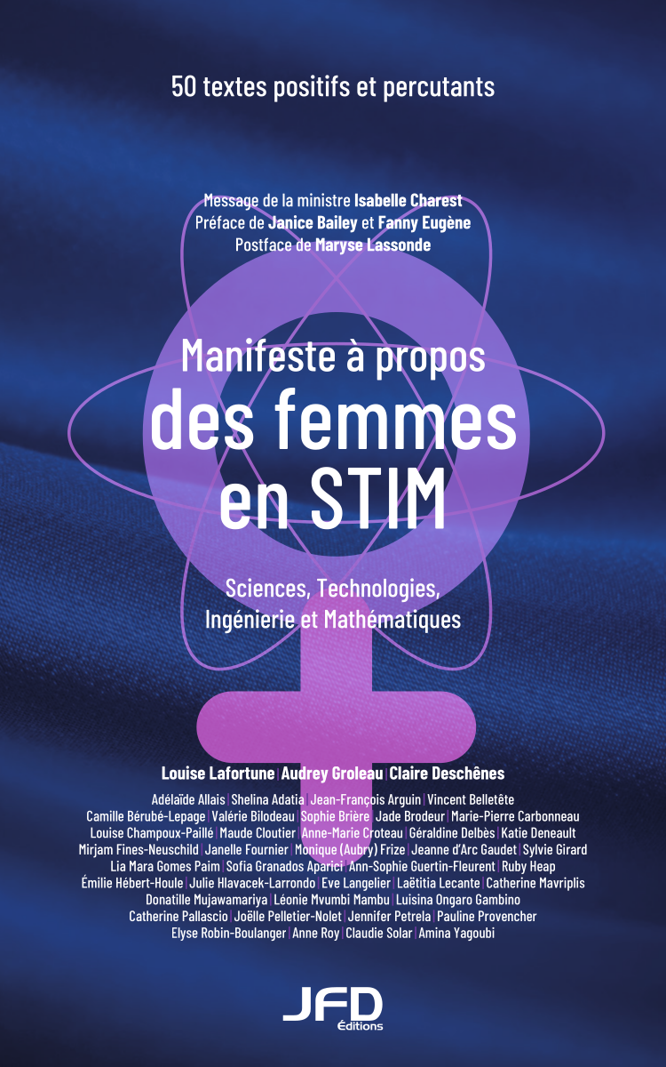 Le Manifeste à propos des femmes en STIM, produit par l’Association de la francophonie à propos des femmes en sciences, technologies, ingénierie et mathématiques (AFFESTIM) et dirigé par Louise Lafortune, Audrey Groleau et Claire Deschênes, rassemble 50 textes qui s’adressent à l’ensemble de la population francophone et francophile canadienne, en interrogeant la situation des femmes en STIM — sciences, technologies, ingénierie et mathématiques — et en l’élargissant aux sciences de la santé et autres disciplines connexes. Il propose: