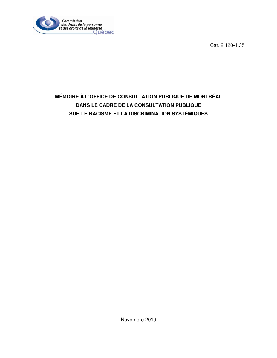 Déposé dans le cadre de la consultation publique de l’Office de consultation publique de Montréal (OCPM) sur le racisme et la discrimination systémiques, ce mémoire de la Commission des droits de la personne et des droits de la jeunesse (CDPDJ) propose une analyse approfondie de ces phénomènes à l’échelle municipale à Montréal.
