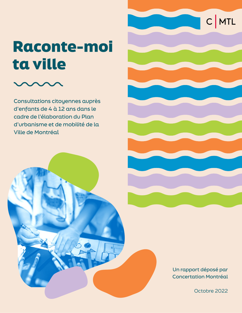 Ce rapport présente les résultats de la campagne Raconte-moi ta ville, une démarche consultative innovante menée par Concertation Montréal (CMTL) de juillet à octobre 2022, auprès d’enfants de 4 à 12 ans. Réalisée dans le cadre de l’élaboration du Plan d’urbanisme et de mobilité 2050 (PUM) de la Ville de Montréal, cette initiative visait à faire entendre la voix des enfants sur l’avenir de leur ville.