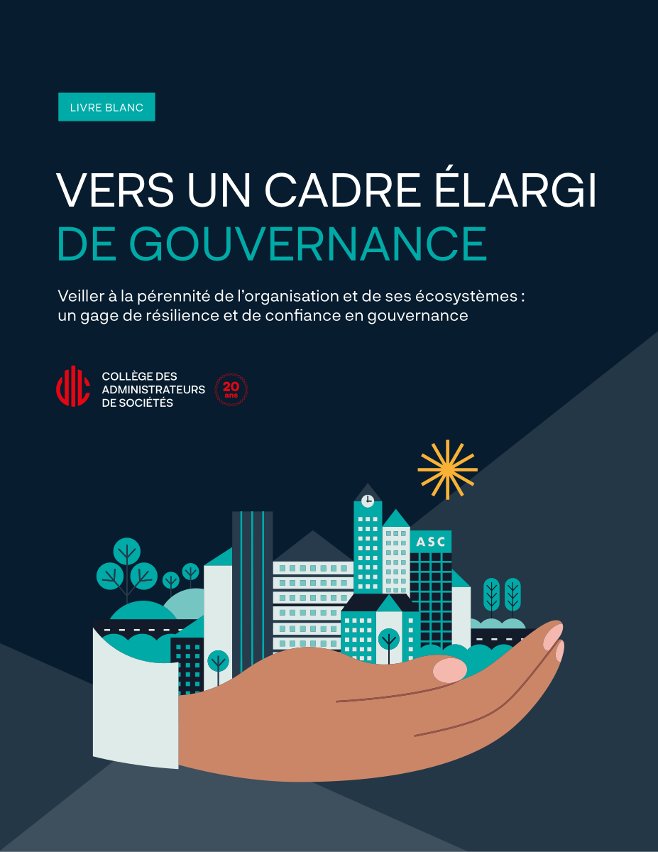 Le livre blanc Vers un cadre élargi de gouvernance constitue une ressource essentielle pour les administratrices, dirigeantes et dirigeants, et professionnel.le.s de la gouvernance souhaitant approfondir leur compréhension des enjeux contemporains et des stratégies favorisant la durabilité et la résilience des organisations.